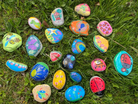 Jeder einzelne Stein ist mit einem bunten Motiv, einem freundlichen Gesicht oder einem farbenfrohen Muster verziert und versteckt worden.