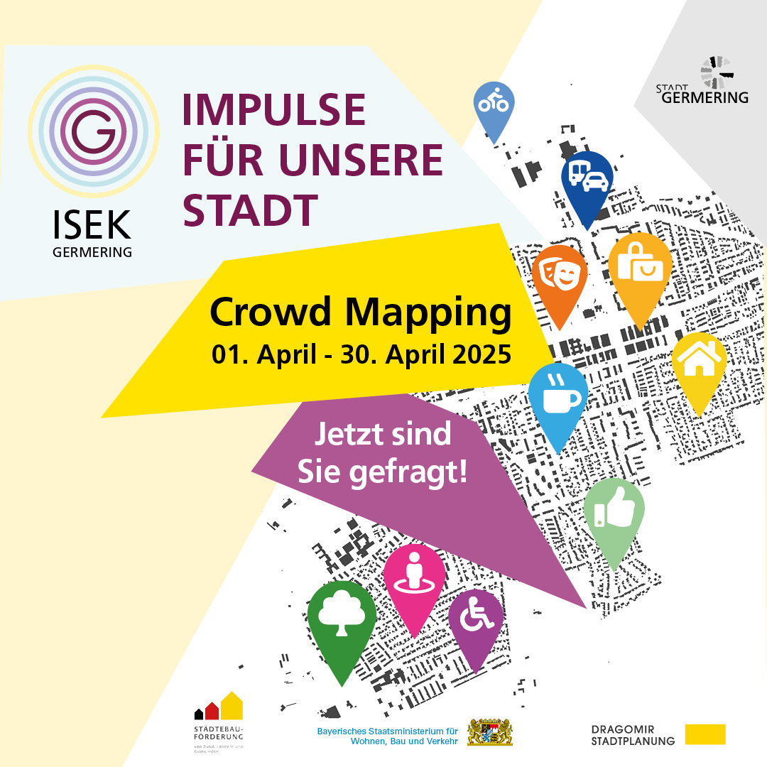 Im April 2025 haben über 2.600 Bürgerinnen und Bürger beim Crowd Mapping mitgemacht. Sie konnten in einer interaktiven Karte Ihre Meinungen, Ideen und Anregungen ortsbezogen eintragen und die Beiträge der anderen Teilnehmenden kommentieren. Insgesamt wurden 759 Einträge und Kommentare abgegeben. Dazu kamen über 6.400 Bewertungen mit "Daumen nach oben" oder "Daumen nach unten". Wir möchten Ihnen sehr für die rege Teilnahme und das große Interesse an der gemeinsamen Gestaltung der zukünftigen Stadtentwicklung Germerings danken! Die Ergebnisse dieses Beteiligungsschritts können Sie in der Dokumentation zum Crowd Mapping unten im Download-Bereich nachlesen.
