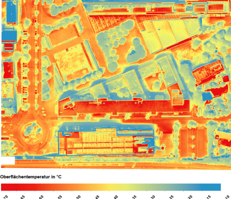 Ein noch genauerer Blick mit der Thermaldrohne zeigt, dass vor allem dunkle und versiegelte Oberflächen zur Erwärmung beitragen, während Bäume und Grünflächen kühlend wirken.