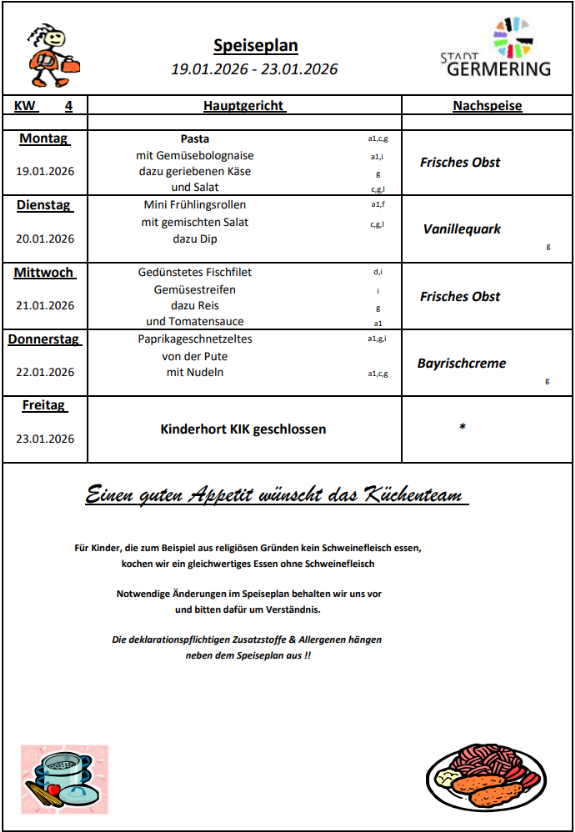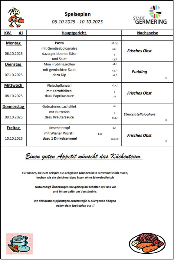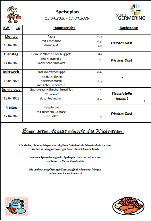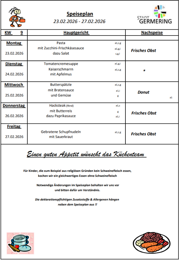 Der Speiseplan ändert sich jede Woche.
